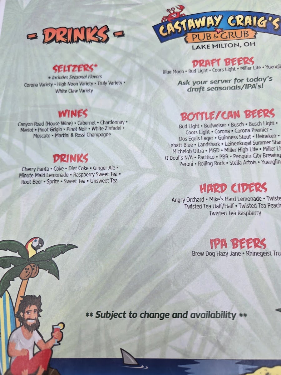 Welcome to Castaway Craig's Pub & Grub, a delightful culinary gem nestled by Lake Milton in Ohio. This inviting eatery strikes the perfect balance between a cozy hideaway and vibrant night spot. The menu features an array of mouthwatering pizzas, with options like the savory Chicken Bacon Ranch and the zesty White Sunburn, showcasing fresh ingredients and unique flavor combinations.